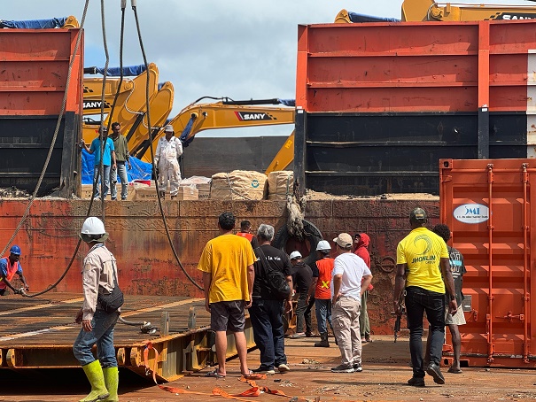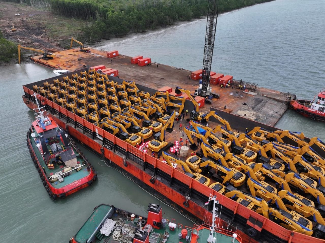 Tampak puluhan excavator tersebut dimuat dengan menggunakan Kapal Tongkang Jhoni IX dengan Takbut Liana L. Proses bongkar muat puluhan alat berar tersebut dipimpin langsung Haji Isam.
