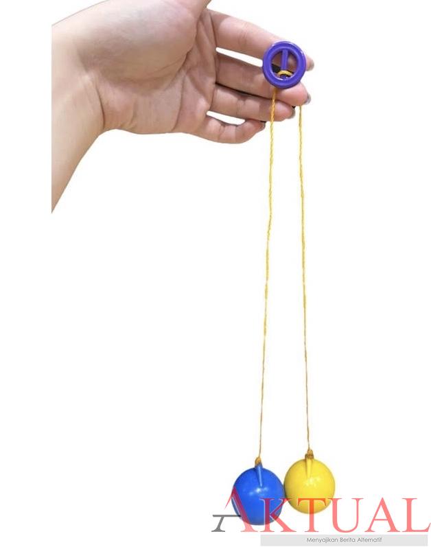 Ya, permainan jadul yang dikenal juga dengan nama pletokan. Setidaknya sangat populer di tahun 60 -70 an. Dua bola kecil padat diberi tali, disatukan. Cara memainkannya simpul tali dipegang jadi satu lalu diayun turun naik sehingga dua bola berbentuk bekel tadi bergerak buka tutup, saling berbenturan ketika bertemu di tengah, lalu menjauh, berbenturan lagi. Begitu seterusnya.
