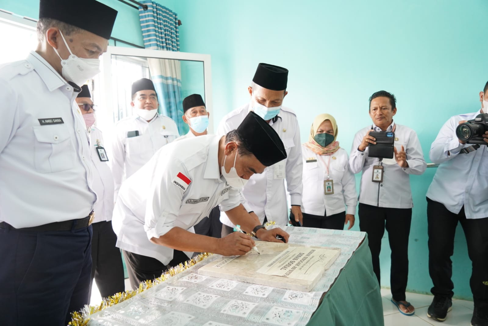 Peresmian ditandai dengan pengguntingan pita dan penandatangaan prasasti oleh Bupati didampingi Kadis Sosial Basuni.