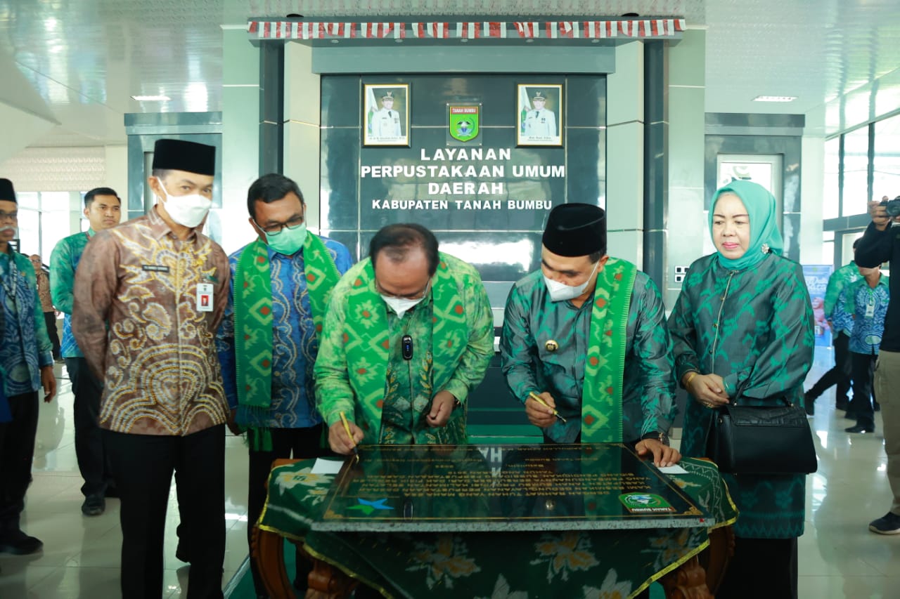 TANAH BUMBU, aktualkalsel.com — Bupati Tanah Bumbu Zairullah Azhar mengukuhkan Bunda Literasi Tanah Bumbu Wahyu Windarti Zairullah dalam rangkaian acara peresmian gedung fasilitas layanan perpustakaan umum daerah Kabupaten Tanah Bumbu di Batulicin, Kamis (4/8/2022 ).