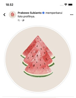 BANJARMASIN aktualkalsel.com–Foto profil di akun face book (fb) kandidat calon presiden 2024 Prabowo Subianto tampak berganti dari biasanya foto diri headshot atau terkadang lambang Partai Gerindra kini menjadi postingan foto potongan buah semangka sejak Senin 6 November 2023 sore.