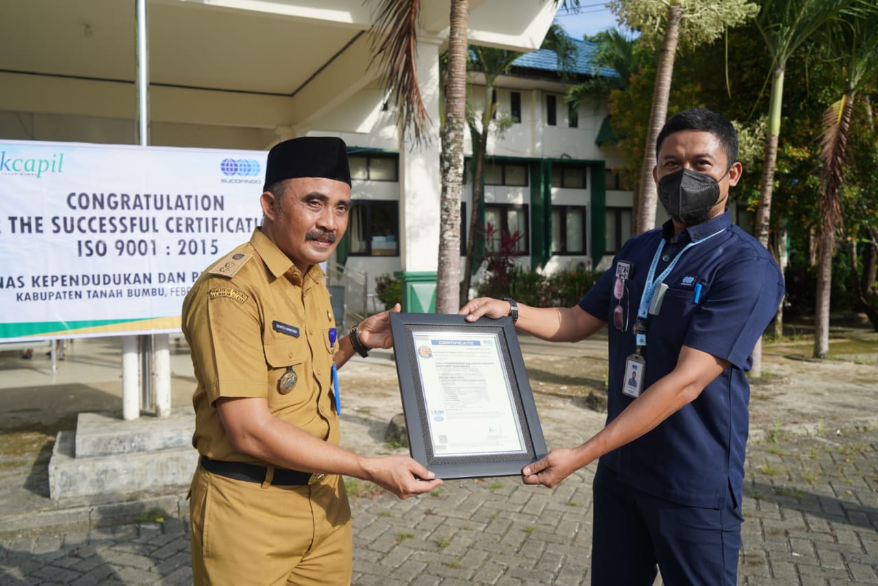TANAH BUMBU, aktualkalsel.com — Disdukcapil Tanah Bumbu Terima Sertifikat ISO Dari Dinas Kependudukan dan Catatan Sipil (Disdukcapil) Tanah Bumbu, Kalimantan Selatan, menerima sertifikat ISO 9001:2015 dari Sucofindo.