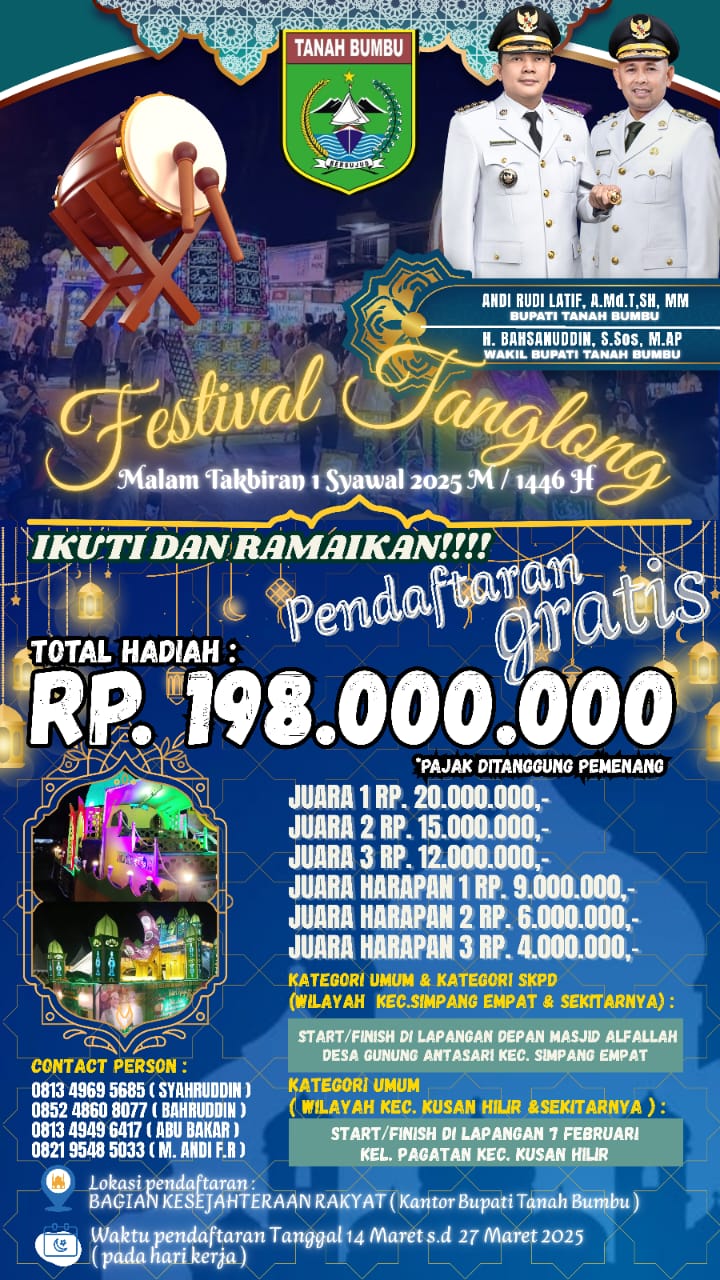 TANAH BUMBU, aktualkalsel.com — Dalam rangka memeriahkan malam takbiran 1 Syawal 1446 H, Pemerintah Kabupaten Tanah Bumbu akan menggelar Festival Tanglong yang penuh semarak dengan total hadiah sebesar Rp198 juta.