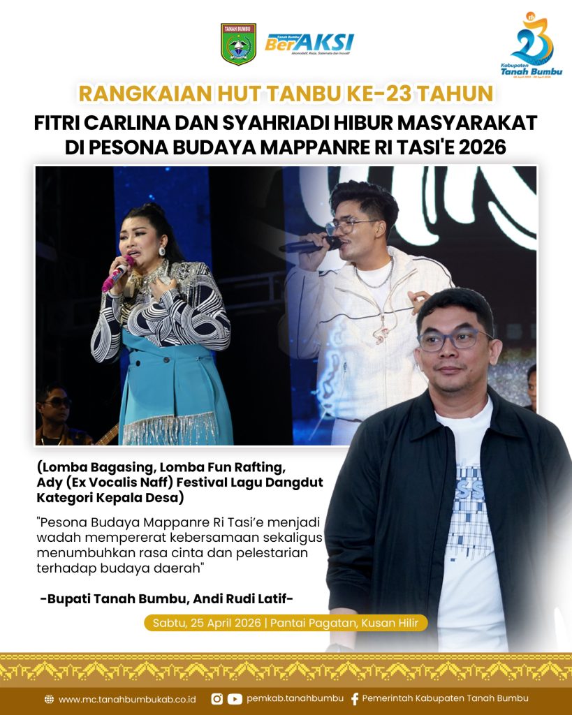 TANAH BUMBU, aktuakalsel.com– Semarak Hari Jadi ke-23 Kabupaten Tanah Bumbu semakin terasa melalui rangkaian Pesona Budaya Mappanre Ri Tasi’e yang menghadirkan hiburan spektakuler bagi masyarakat, Sabtu (25/4/2026).