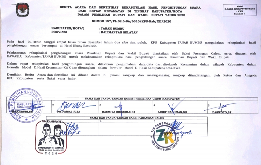 Rekapitulasi tersebut merupakan hasil final dari perhitungan suara untuk Pemilihan Bupati Wakil Bupati Tanbu dan Gubernur Wakil Gubernur Kalimantan Selatan.
