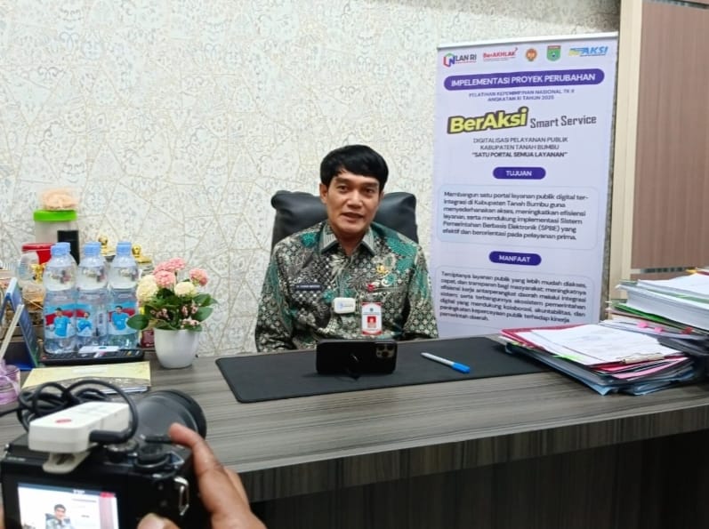 TANAH BUMBU, aktualkalsel.com — Dalam rangka Implementasi Proyek Perubahan Tahun 2025, Kepala Dinas Komunikasi Informasi Statistik dan Persandian (Diskominfosp) Kabupaten Tanah Bumbu memprakarsai Inovasi BerAksi Smart Service yang merupakan Digitalisasi Pelayanan Publik Kabupaten Tanah Bumbu “Satu Portal Semua Layanan”.