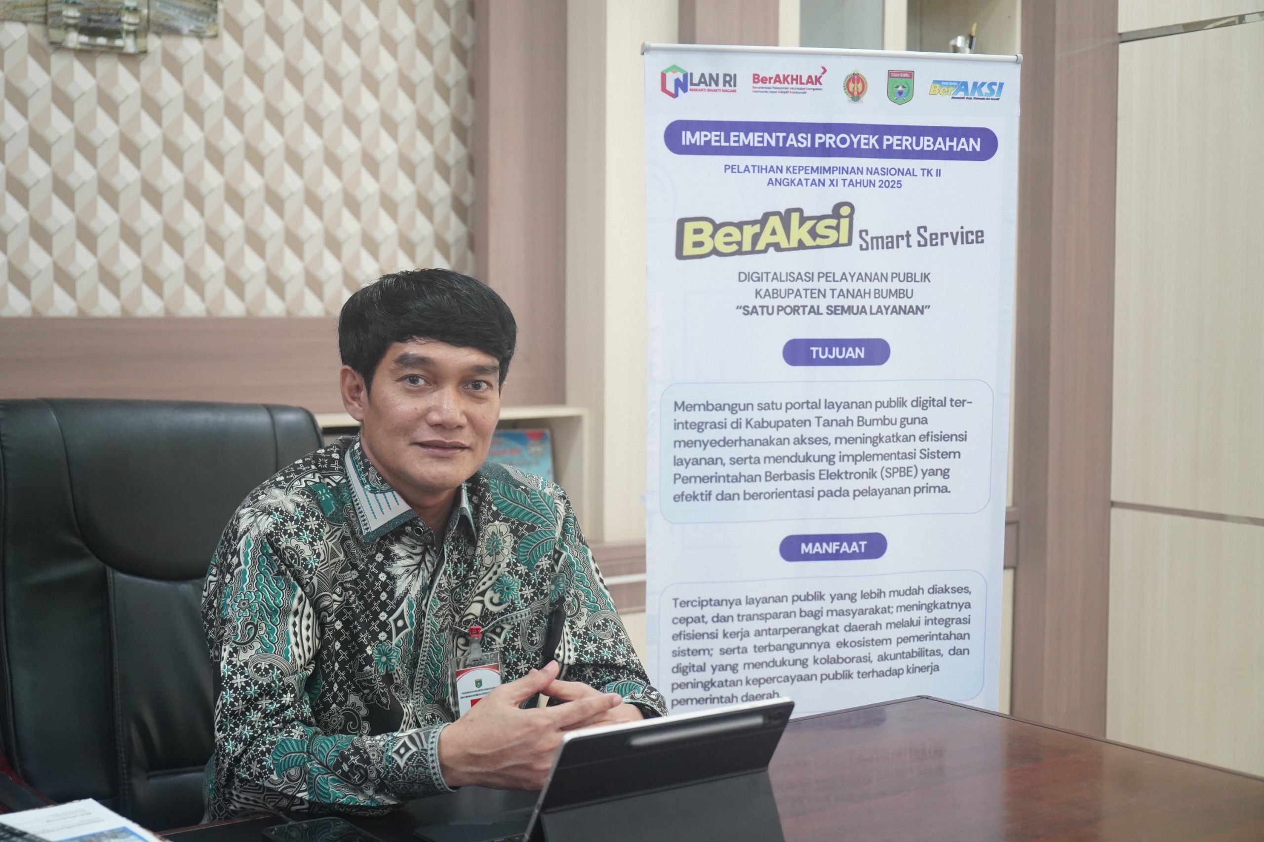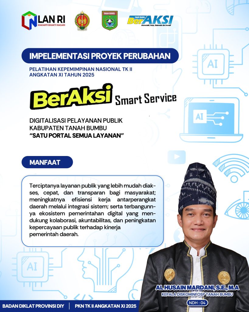 TANAH BUMBU, aktualkalsel.com — Kepala Dinas Komunikasi Informatika Statistik dan Persandian (Diskominfosp) Kabupaten Tanah Bumbu, Al Husain Mardani gagas inovasi BerAksi Smart Service “Satu Portal Semua Layanan”.