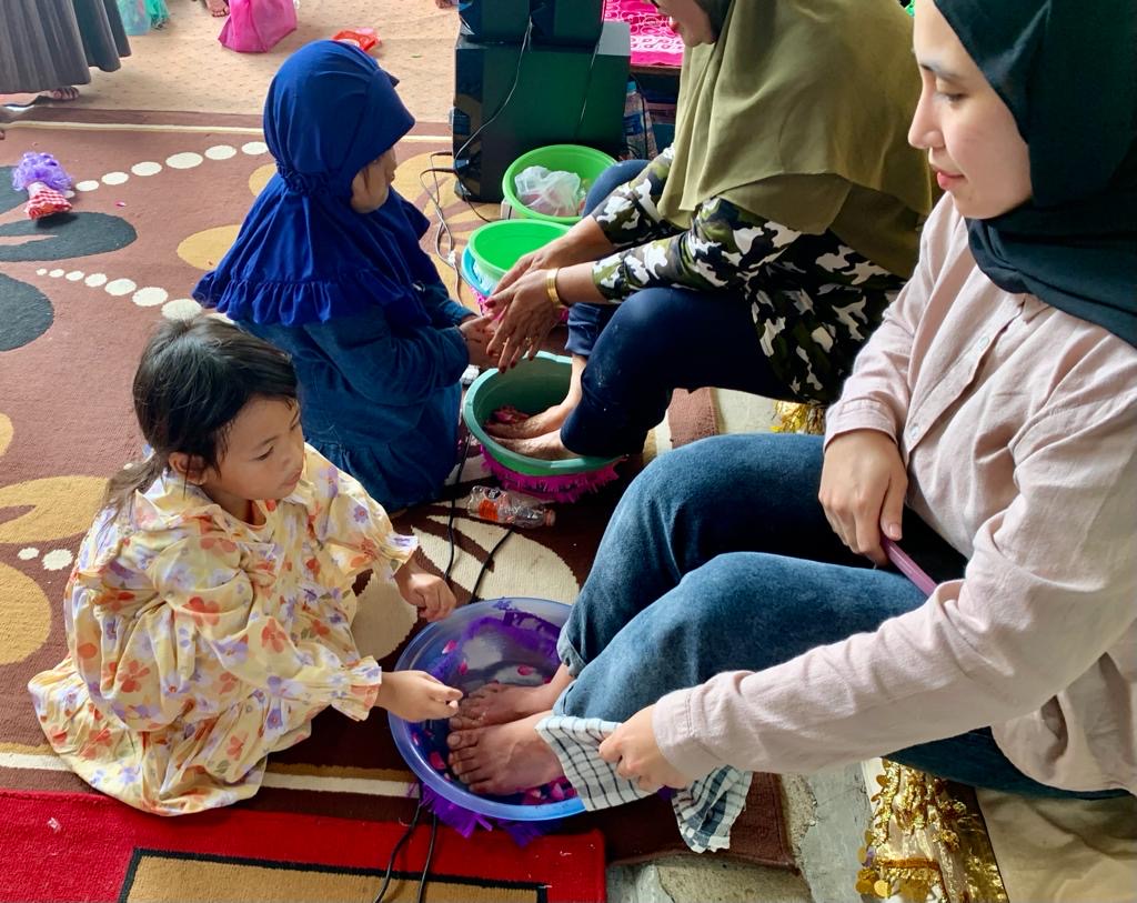 Dibimbing para guru di sekolah itu, mereka secara bergantian bersimpuh di hadapan para ibu yang melahirkan mereka untuk membersihkan kedua telapak kaki dengan air wewangian dari bunga segar.
