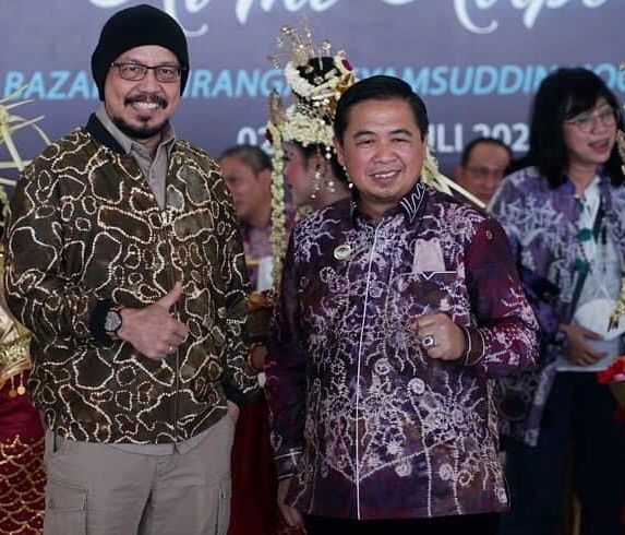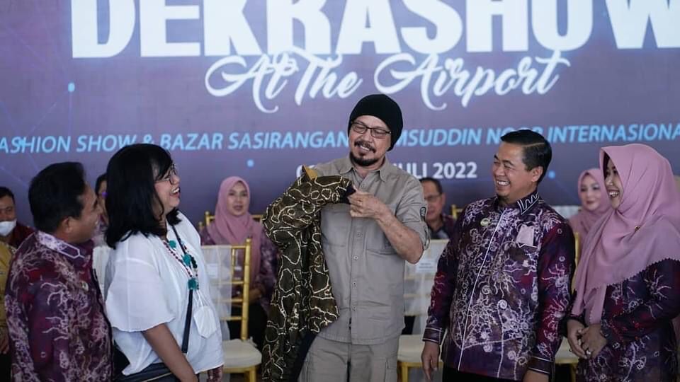 BANJARMASIN aktualkalsel.com–Pimred MetroTv Andy Flores Noya host ‘Kick Andy’ mendapat hadiah jaket sasirangan yang motifnya tergolong langka ketika dia menghadiri Dekranas Show II yang berlangsung di ruang keberangkatan Bandara Syamsudin Noor, Banjarbaru, Sabtu 2 Juki 2022.