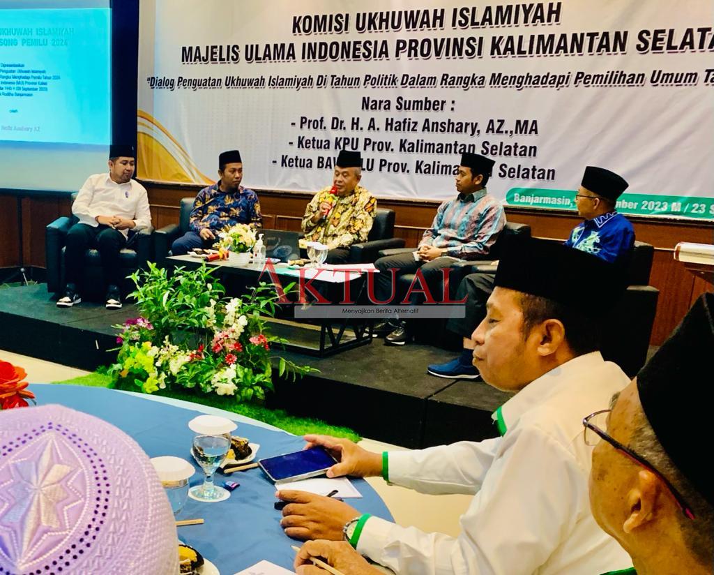 Dialog Penguatan Ukhuah Islam di Tahun Politik itu menampilkan nara sumber lain seperti Wakil Ketua DPRD Kalsel M Syarifudin, Ketua Bawaslu Kalsel Aries Murdiono dan anggota KPU Kalsel M Fahmi Failasopa. Dialog dibuka Ketua Umum MUI KH Husin Naparin.(uumsri)