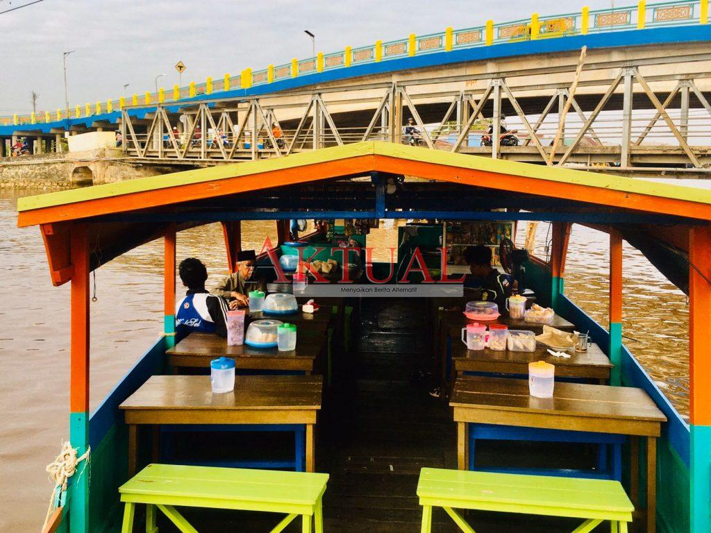 BANJARMASIN aktualkalsel.com–Ini angkringan H Hamdani yang disulap dari perahu kelotok menjadi warung ala ala kafe di muara Sungai Kuin tepatnya di depan Makam Sultan Suriansyah Banjarmasin Utara, Kalimantan Selatan.