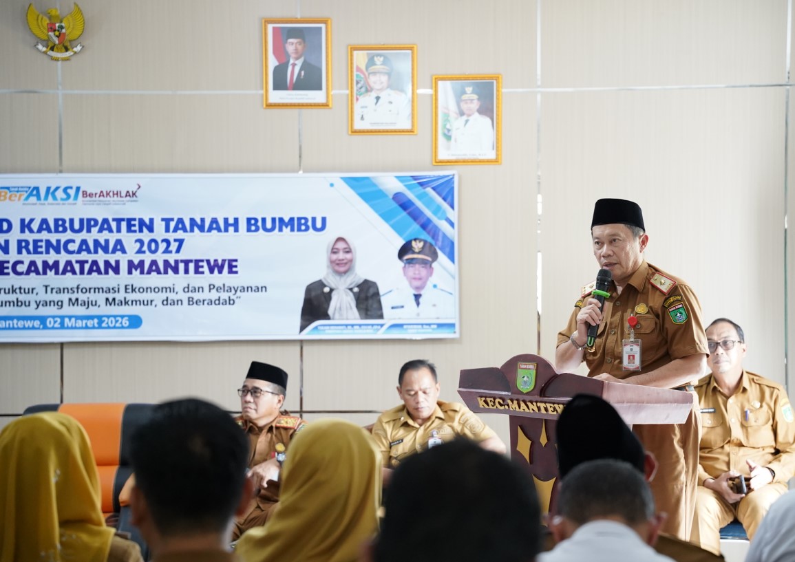 TANAH BUMBU, aktualkalsel.com – Musrenbang RKPD Kabupaten Tanah Bumbu Tahun Rencana 2027 Tingkat Kecamatan Mantewe dan Kecamatan Karang Bintang digelar Senin (2/3/2026). Musrenbang kali ini mengangkat tema : “Transformasi Infrastruktur, Transformasi Ekonomi, dan Pelayanan Publik Menuju Tanah Bumbu Maju, Makmur, dan Beradab”.
