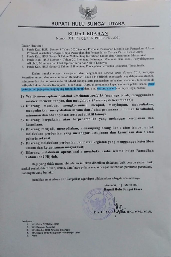 AMUNTAI, aktualkalsel.com — Dalam rangka menjaga ketertiban umum, ketentraman masyarakat dan kesucian bulan Ramadhan tahun 1442 Hijriyah di masa pandemi Covid-19, Bupati Hulu Sungai Utara (HSU) secara resmi mengeluarkan surat edaran (SE) Nomor 3 31.1/185/ Satpol PP-PK/2021.
