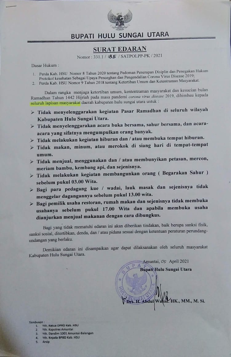 Surat edaran yang ditandatangani Bupati HSU H Abdul Wahid HK tertanggal 5 April 2021 itu, Pemkab HSU secara tegas menghimbau kepada seluruh lapisan masyarakat untuk tidak menyelenggarakan kegiatan pasar Ramadhan di seluruh wilayah Kabupaten HSU.