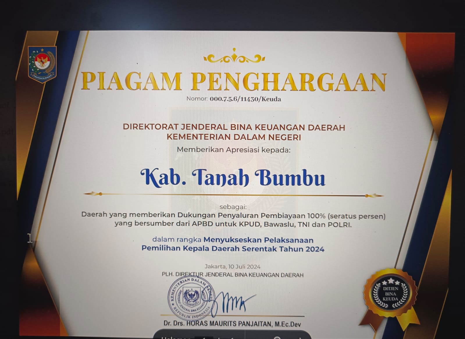 TANAH BUMBU, aktualkalsel.com — Pemerintah Kabupaten (Pemkab) Tanah Bumbu mendapat penghargaan penyelesaian pencairan 100% dana hibah Pilkada serentak 2024.