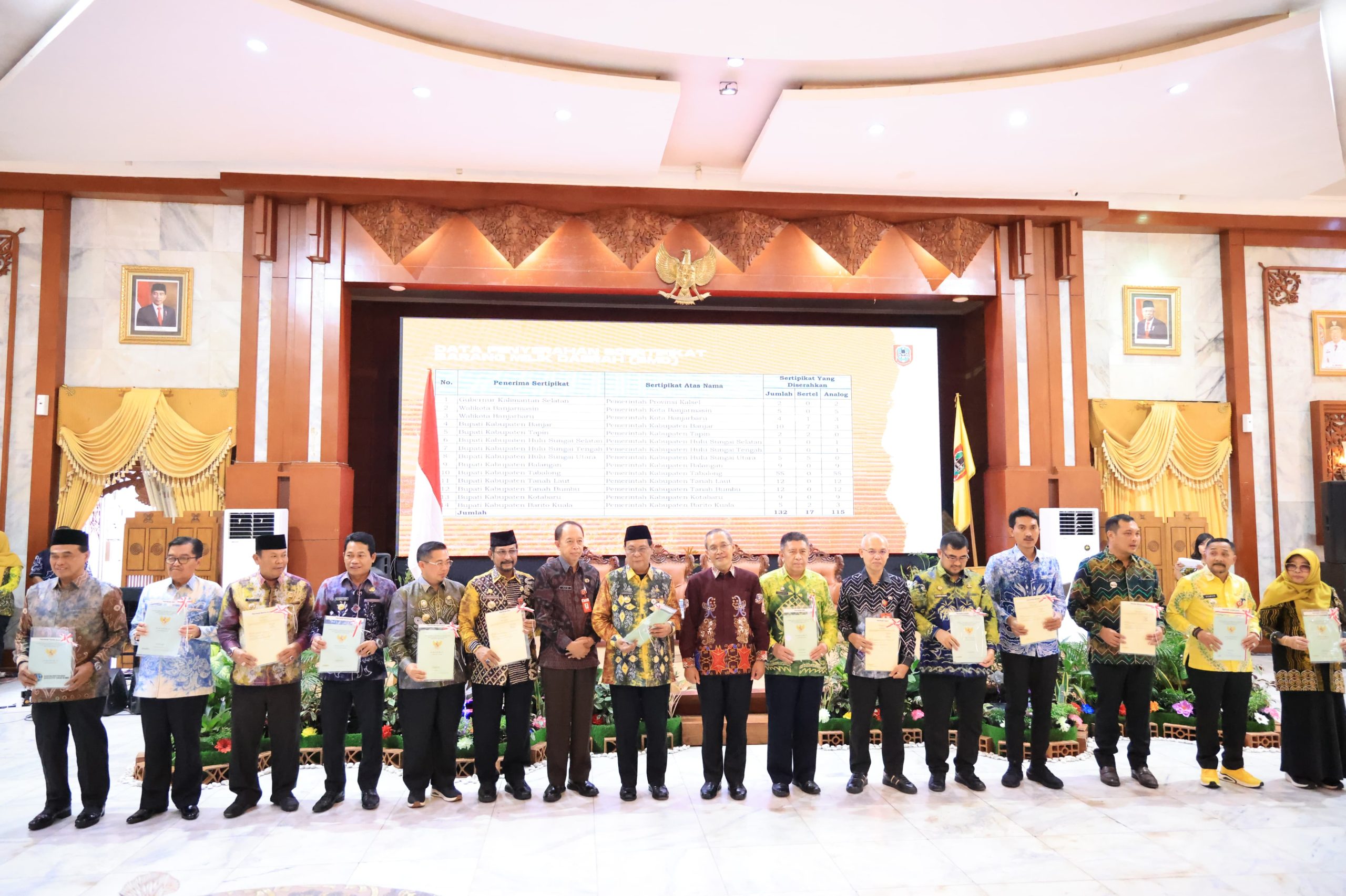 Rakor juga di rangkai dengan penyerahan sertifikat barang milik daerah yang diserahkan oleh Pimpinan KPK di damping Kakanwil BPN Kalsel kepada Gubernur, Bupati, dan Walikota se-kalimantan Selatan.