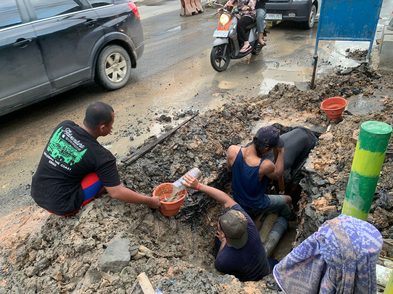 TANAH BUMBU, aktualkalsel.com — Perbaikan emergency pipa distribusi diameter 200 MM ( PVC ) di Simpang Empat Lampu Merah Plajau — yang sempat membuat pelayanan air bersih ke rumah pelanggan terganggu — sudah selesai diperbaiki.