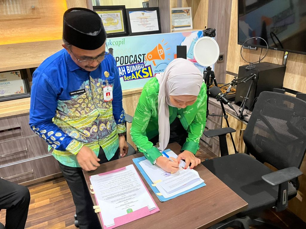 TANAH BUMBU, aktualkalsel.com — Kepala Dinas Kependudukan dan Catatan Sipil Tanah Bumbu (Disdukcapil Tanbu) Gento Hariyadi, dan Kepala Dinas Perpustakaan dan Kearsipan (Dispersip) Tanbu, Yulia Ramadani melakukan penandatanganan perpanjangan kerjasama Pemanfaatan Data Kependudukan dan Pemanfaatan Kartu Identitas Anak (KIA), Kamis (31/7/2025) di Batulicin.