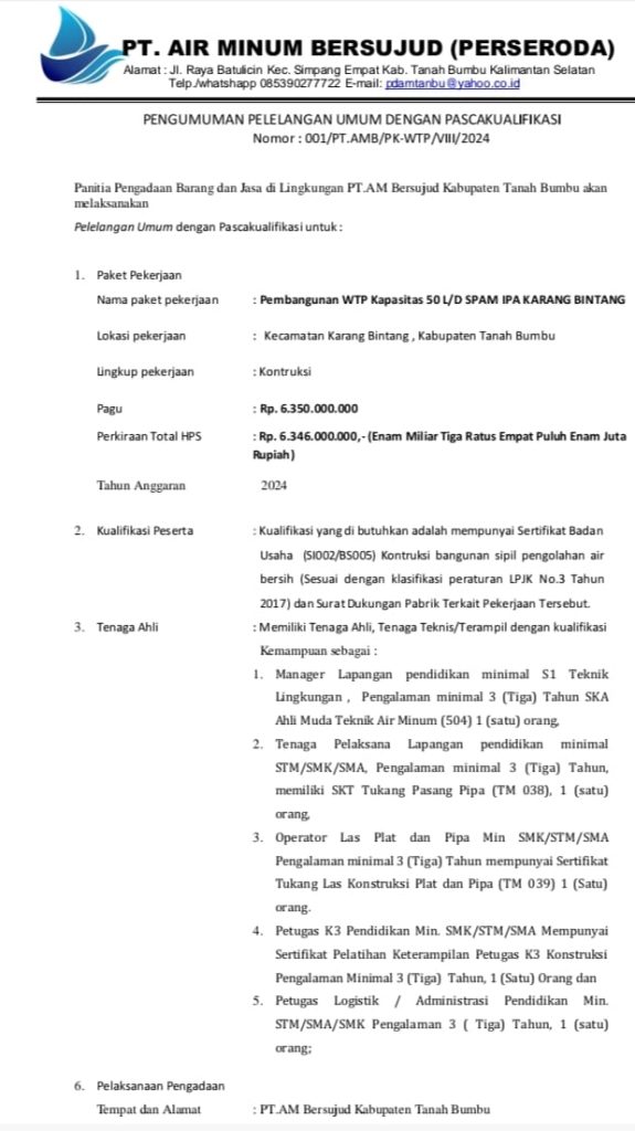 TANAH BUMBU, aktualkalsel.com — PT. Air Minum Bersujud (Perseroda) akan melaksanakan Tender Pengadaan Fisik Water Treatment Plan (WTP) kapasitas 50 lps di IPA Karang Bintang, RT.02 Desa Karang Bintang, Kecamatan Karang Bintang, Kabupaten Tanah Bumbu, Kalimantan Selatan, dengan pagu Rp 6.350.000.000.