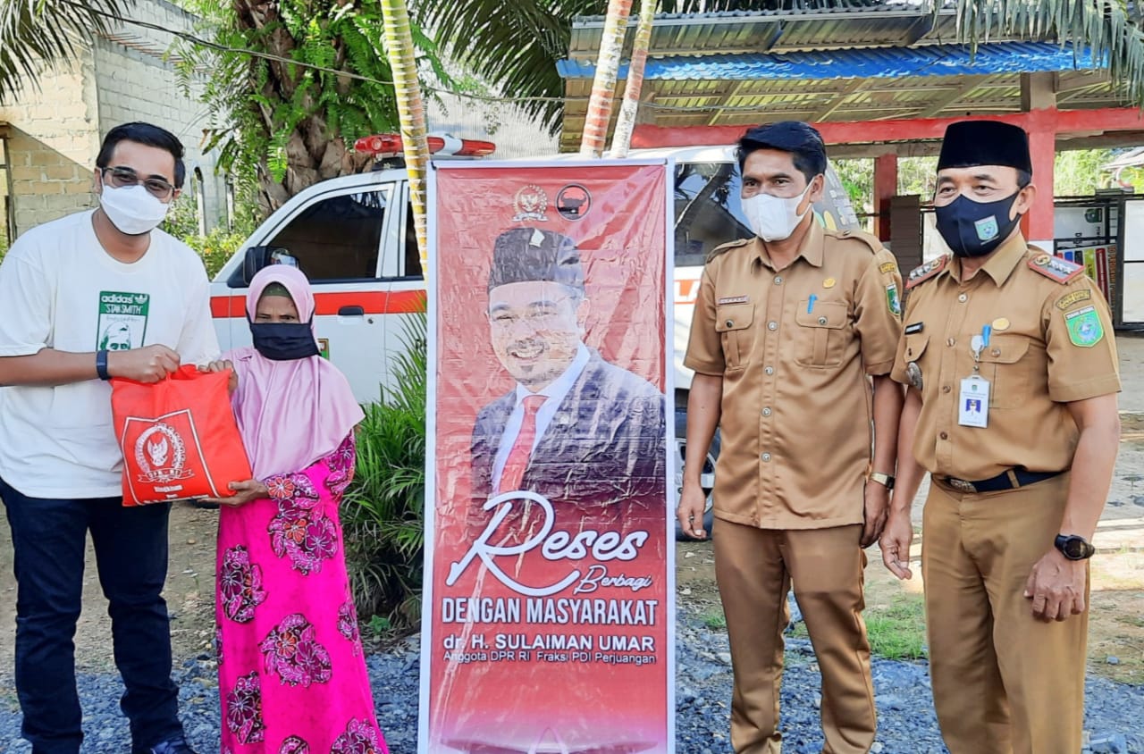 TANAH BUMBU, aktualkalsel.com — Anggota Komisi VII DPR-RI Sulaiman Umar didampingi Camat Kusan Hulu Herlambang, Senin ( 12/4/2021 ), memberikan bantuan sembako kepada masyarakat di dua desa, kecamatan setempat.