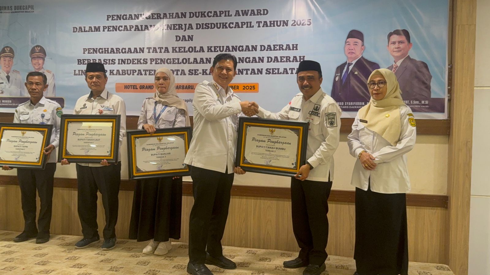 Prosesi penyerahan berlangsung dalam rangkaian acara Penganugerahan Dukcapil Award 2025, Rabu, (10/12/2025) di Hotel Grand Qin, Banjarbaru.