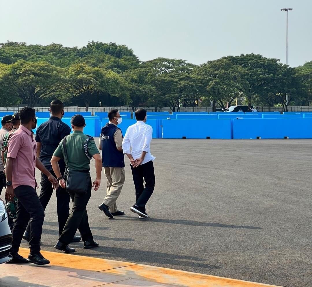 Mengenakan kemeja putih digulung setengah lengan, celana hitam plus sepatu sneakers warna senada, Jokowi didampingi Gubernur Jakarta Anies Rasyid Baswedan yang bakal jadi tuan rumah balapan mobil kelas dunia itu. Sementara Anies mengenakan pakaian lapangan warna coklat plus rompi kehitaman.