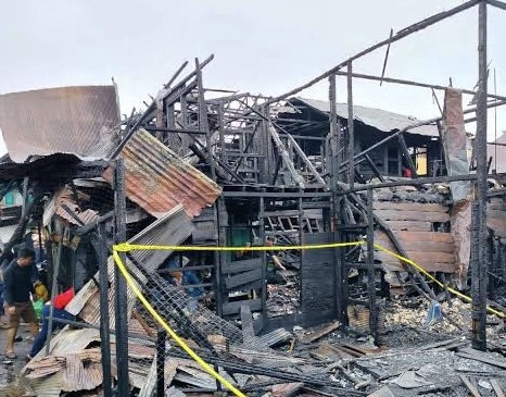 Ada sekitar tujuh bangunan yang luluh lantak dilanda si jago merah ini dan diperlukan waktu sekitar satu jam bagi barisan damkar yang berjibaku di sana untuk memadamkan api.