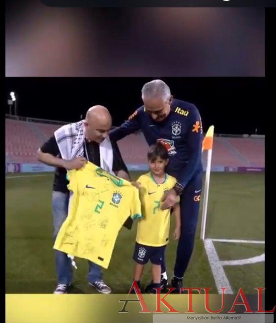 Tak dinyana, dia mendapat hadiah istimewa dari pelatih Timnas Brasil Tite sebuah jersey kandang kesebelasan papan atas dunia ini lengkap dengan tanda tangan seluruh pemainnya. Tentu ini hadiah yang tak mungkin diimpikan penonton umumnya.