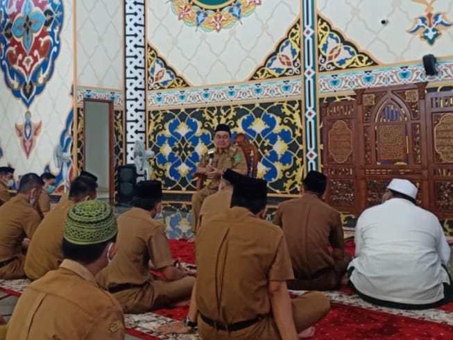 Bupati Kabupaten Tanah Bumbu Zairullah Azhar didampingi PJ Sekda Ambo Sakka dan jajarannya menggelar sholat Duha dan zikir bersama yang bertempat di masjid Agung Nurussalam, Selasa ( 11/5/21.